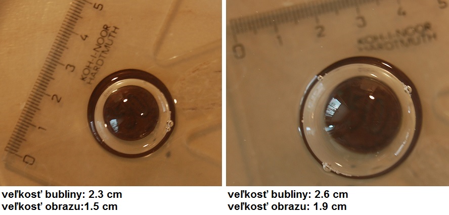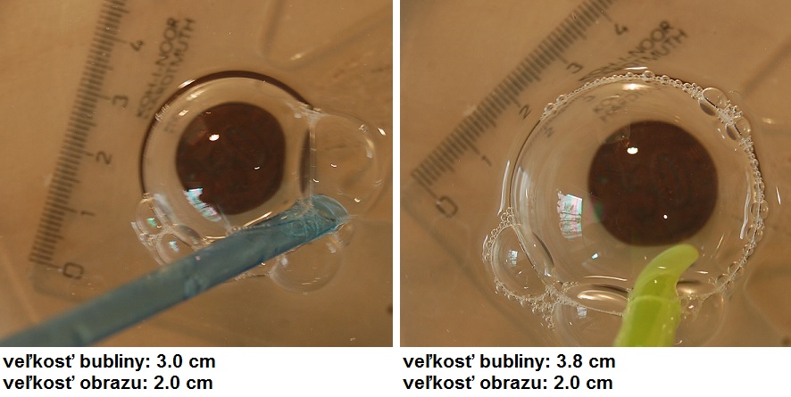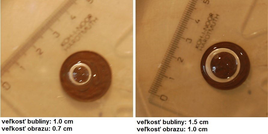 Určte závislosť zmenšenia (zväčšenia) obrazu predmetu ležiaceho na dne misky pri zvislom pohľade naň cez (pol-)bublinu plávajúcu na vode (alebo slabom mydlovom roztoku) od polomeru bubliny a pokúste sa vysvetliť, prečo vlastne k zmenšeniu dochádza.