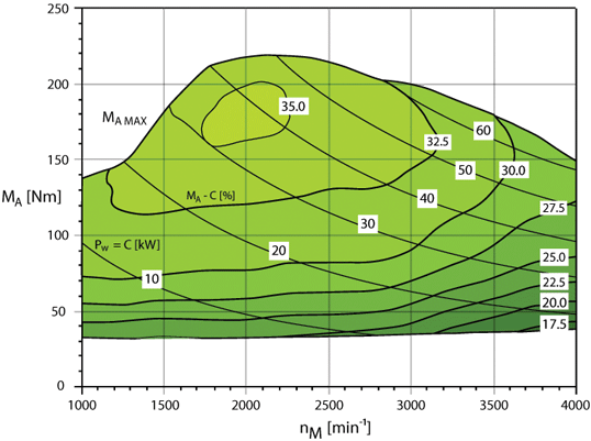 Taktiež môžme vidieť, že daný motor by už nebol schopný dodať výkon $\SI{70}{\kilo\watt}$ (tj. má „maximálny výkon“ okolo $\SI{65}{\kilo\watt}$.) Čo je na tomto grafe najzaujímavejšie je, kde je motor najefektívnejší. Hoci by človek pri aute intuitívne povedal, že s najťažším prevodom a najnižšími otáčkami je spotreba najmenšia, nemusí to byť pravda. Pre veľmi malé výkony $\SI{10}{\kilo\watt}$ sa to podľa grafu tak zdá (sme v najžltšej vrstevnici) – zvolíme najťažší prevod, máme najmenšie otáčky, účinnosť je najväčšia.