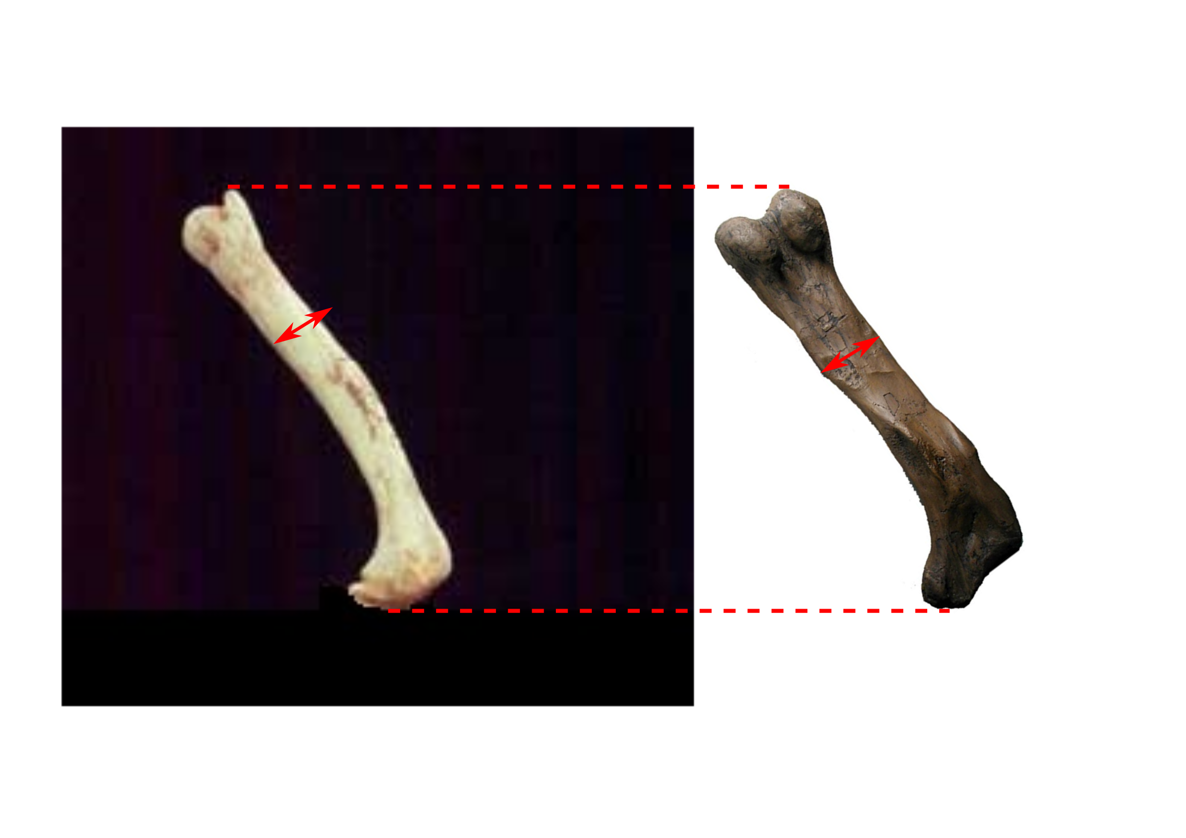 Zistite, ktorá kosť patrí ktorému dinosaurovi. Nezabudnite to odargumentovať po fyzikálnej stránke a svoje argumenty podložte aj matematicky. Môžete predpokladať, že oba dinosaury mali veľmi podobnú stavbu tela. Červené šípky na obrázku majú rovnakú dĺžku. Na záver sa skúste zamyslieť, prečo rozmery kostí presne nesledujú teoretickú predpoveď.