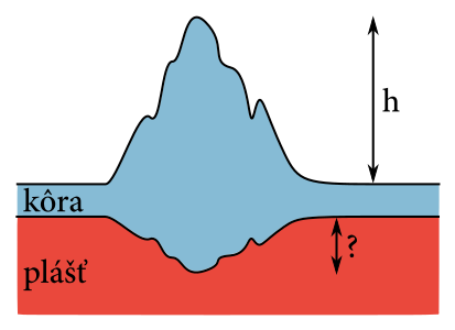Ten predpokladá, že od istej hĺbky pod zemským povrchom tlak nezávisí od zemepisnej dĺžky ani šírky. Nakoľko chceli, aby ich model bol fyzikálne aj geograficky presný, povedali si, že vymodelujú aj pohoria. Dlho sa dohadovali na tom, ako hlboko by mal siahať „koreň“ (t. j. časť kôry pretŕčajúca do plášťa) hory výšky $h$, ak hustota plastelíny zvolenej pre kôru, respektíve plášť je $\rho_k$, $\rho_p$, $\rho_k<\rho_p$. Pokúste sa im s týmto problémom pomôcť.