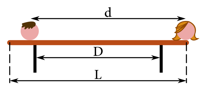 Preto sa k nej začal pomaly posúvať. Po istom čase sa však neprajná lavička prevážila na stranu a Simon aj so slečnou sa z nej zosypali. Kde na lavičke sa v tomto momente Simon hmotnosti $m_{SI}$ nachádzal, ak si slečna s hmotnosťou $m_{SL}$ sadla na opačný koniec lavičky? Lavička je osovo súmerná, má hmotnosť $M$, dĺžku $L$ a rozostup oporných bodov $D$.