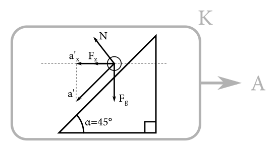 Predstavme si, že sa nachádzame vo vzťažnej sústave $K$ spojenej s klinom. Klin však zrýchľuje vzhľadom na prednáškovú sálu, teda táto sústava je neinerciálna. V praxi to znamená, že na hmotný bod bude pôsobiť zotrvačná sila $F_z = mA$, viď obrázok. Presne táto sila je to, čo nás tlačí do sedadla keď sedíme v zrýchľujúcom aute. Na hmotný bod v tejto sústave navyše pôsobia všetky sily, ktoré naň pôsobili v inerciálnej sústave (tiaž $F_g$ a normálová sila $N$).