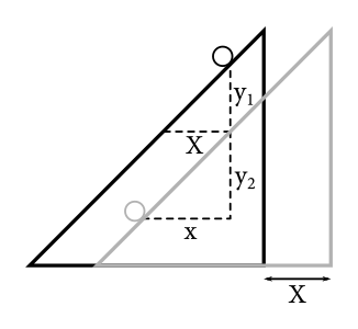 Vidíme, že keď sa bod pohne o $x$ doľava a klin sa pohne o $X$ doprava, tak na to, aby bod zostal na povrchu klinu, musí vertikálne klesnúť o $$ \begin{aligned} y &= y_1 + y_2 = X \tan \alpha + x \tan \alpha \ &= X + x = x \left(1 + \frac{m}{M}\right), \ \end{aligned} $$ kde v poslednom kroku sme využili rovnicu 1, keďže $x = \frac{1}{2}at^2$, $X = \frac{1}{2}At^2$, $mx = MX$. To ale znamená, že bod sa pohybuje po priamej trajektórii pod uhlom $\beta$ voči horizontále, $$ \tan \beta = \frac{y}{x} = \left(1 + \frac{m}{M}\right). $$