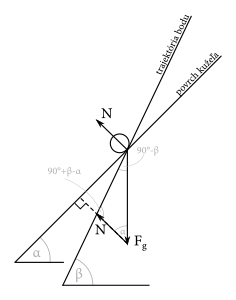 Všimnite si, že silu $N$ sme prekreslili tak, aby začínala na konci $F_g$ - tak sa graficky sčítavajú sily. Zo sínusovej vety v trojuholníku tvorenom vektormi $N$ a $F_g$ dostaneme $$ \begin{aligned} \frac{N}{\sin \left(\ang{90} - \beta\right)} &= \frac{F_g}{\sin \left(\ang{90} + \beta - \alpha\right)}, \ N &= mg\frac{\cos \beta}{\cos \left(\alpha - \beta\right)} = mg\frac{\cos \beta}{\cos \alpha \cos \beta + \sin \alpha \sin \beta}, \ N &= mg \frac{1}{\cos \alpha + \sin \alpha \tan \beta}, \ N &= \sqrt{2} g \frac{mM}{m+2M}. \ \end{aligned} $$