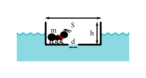 Ferdo mravec sa vybral na romantický splav pozdĺž Hrona v zápalkovej škatuľke. Čo sa však stalo – nestalo, Ferdo nabúral do prekážky a zostal svojou kanojkou o ňu zakliesnený bokom tak, že sa vzhľadom na breh nehýbal. Na dne kanojky sa mu spravila dierka, do kanojky mu začala vtekať voda, začala sa ponárať, až sa úplne potopila. V tomto okamihu znamenala pre Ferda schopnosť plávať otázku života a smrti. Koľko času od vzniku diery teda Ferdovi zostávalo, aby sa naučil plávať? Dierka na podlahe má priemer $d = \SI{1}{\milli\metre}$. Škatuľka má výšku $h = \SI{2}{\centi\metre}$ a jej podlaha má obsah $S = \SI{20}{\centi\metre\squared}$. Ferdo aj s krabičkou váži $m = \SI{1}{\gram}$. Hron je takou riekou, že rýchlosť jej tečenia je blízko hladiny lineárne závislá od hĺbky a to tak, že na hladine tečie s rýchlosťou $v_0=\SI{0,5}{\metre\per\second}$ a v hĺbke $x$ tečie rýchlosťou $v_0-\frac{x}{\SI{10}{\second}}$.