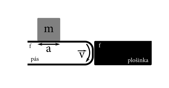 Bob staviteľ si položil veľkú betónovú kocku s hranou dĺžky $a$ a hmotnosťou $m$ na dopravníkový pás. Ten končí tak, že kváder z neho plynule prejde na stojacu plošinku. Koeficient šmykového trenia medzi kockou a pásom či plošinkou je $f$. Bob nastavil rýchlosť pásu $v$ na najmenšiu takú rýchlosť, aby sa betónová kocka dostala celá na plošinku. Ako dlho trvalo kocke zastaviť od momentu, kedy sa jej prvá časť ocitla na plošinke?