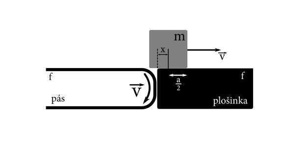 Predstavme si najprv, čo očakávame, že sa s kockou stane: chvíľu sa povezie na bežiacom pásme, a keď sa dostatočne vytrepe na plošinku, začne brzdiť, až úplne zastaví. Počas tohto deja na ňu budú pôsobiť dve sily: trecia sila od bežiaceho pása $F_\rightarrow$ a trecia sila od plošinky $F_\leftarrow$.