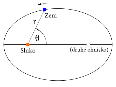 Polohu Zeme vzhľadom na Slnko tak budeme popisovať dvojicou $(r,\theta)$, kde $r$ predstavuje vzdialenosť Zeme a Slnka a $\theta$ je orientovaný uhol, ktorý zviera úsečka spájajúca Zem a Slnko s úsečkou, ktorá spája ohniská elipsy (v jednom z nich je Slnko). Za kladný uhol určíme ten, v ktorom Zem obieha okolo Slnka.