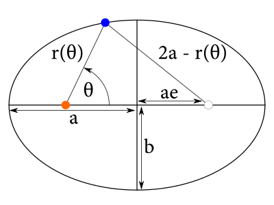 Preto uvažujme trojuholník tvorený ohniskami a Zemou. Vzdialenosť Zem-Slnko je $r(\theta)$. Vzdialenosť ohnísk je $2ae$. Napokon, pre každý bod elipsy platí, že súčet jeho vzdialeností od ohnísk je rovný $2a$. Preto je vzdialenosť Zeme od druhého ohniska elipsy rovná $2a-r(\theta)$. Z kosínusovej vety pre zmienený trojuholník tak dostávame: