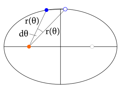 Podľa druhého Keplerovho zákona je preto $\frac{1}{2}r^2(\theta) \dot \theta$ konštantné. Keď nasčítame takéto plôšky pre všetky časové intervaly $\mathrm{d}t$ z periódy obehu Zeme $T$, dostaneme 6: