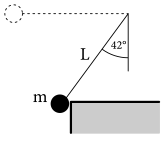 Rony svoj hmotný bod priviazal na klinec vo výške $h = 0$, vychýlil ho do vodorovnej polohy a pustil. Hmotný bod dokonale pružne narazil do bočnej strany ťažkého stola. Nitka vtedy zvierala so zvislým smerom uhol $\alpha \leq \ang{42}$. Do akej výšky sa hmotný bod odrazí?